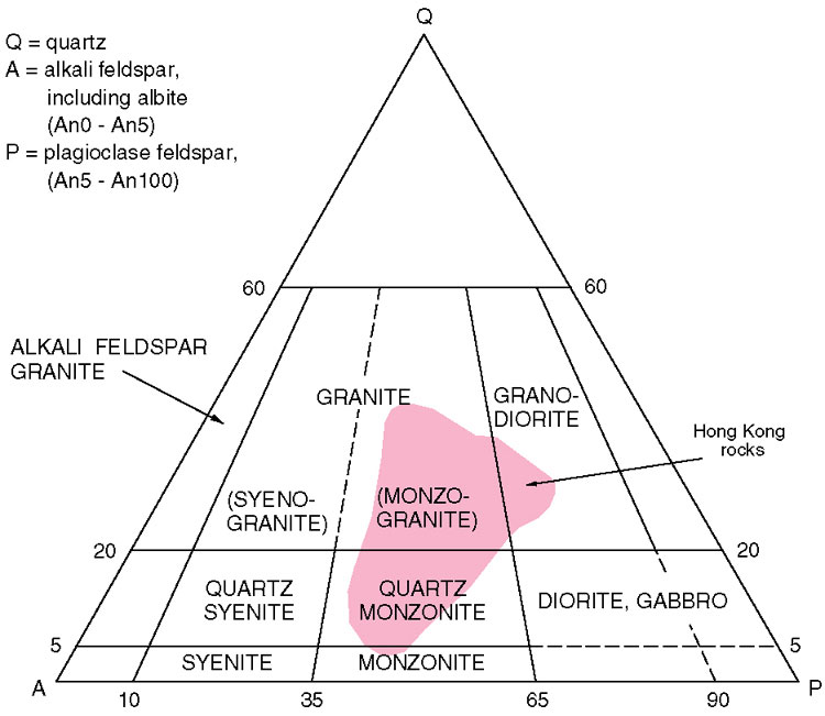 Plutonic and volcanic rocks are generally classified according to their modal mineralogy, based on the relative proportions of quartz (Q), alkali feldspar (A), plagioclase (P), feldspathoids (F), and mafic (M) and related minerals (Le Maitre, 1989). In Hong Kong, however, many of the minor intrusive rocks (rhyolite dykes) and volcanic rocks are so fine grained that individual crystals are impossible to distinguish, even under the microscope. Therefore, to facilitate comparisons with the volcanic rocks, the granitoid rocks are classified according to their normative mineralogy based on whole-rock chemical compositions. Since there are no known silica undersaturated (or feldspathoid-bearing) plutonic rocks in Hong Kong, the normative QAP diagram of Le Maitre (1989) is used (Figure 6.2).