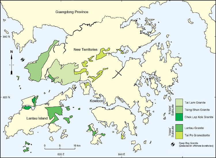 Twenty major and six minor intrusive units have been identified in Hong Kong (Figure 6.3, Figure 6.4, Figure 6.5 & Figure 6.6). The major units consist of granitoid plutons and stocks, whereas the minor units essentially comprise dyke swarms. With the exception of the Triassic Deep Bay Granite, the granitoids are described in terms of plutonic suites according to established field, petrographic and age relationships.