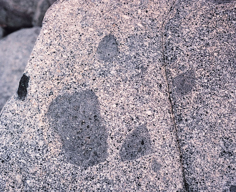 Dark-coloured inclusions (or enclaves) are common amongst the granitoids of the Cheung Chau and Lion Rock suites, and are found in small concentrations in older plutons of the Lamma Suite. Most of the enclaves in the Cheung Chau and Lion Rock suites are ellipsoidal and less than 0.5 m in diameter, and are considered to represent immiscible globules of mafic magma of the same age. A concentration of angular rock fragments in granodiorite exposed on Stanley Peninsula (Plate 6.3) is thought to represent incorporation of country rock from an earlier magmatic phase (Tuen Mun Formation). On Lamma Island, there is abundant evidence of mingling of mafic and granitoid magma in the youngest plutons of the Lion Rock Suite. Composite mafic–felsic dykes in northern Lantau Island, and on Sung Kong Island (Plate 6.4), also indicate bimodal magmatism, which is typical of extensional environments.