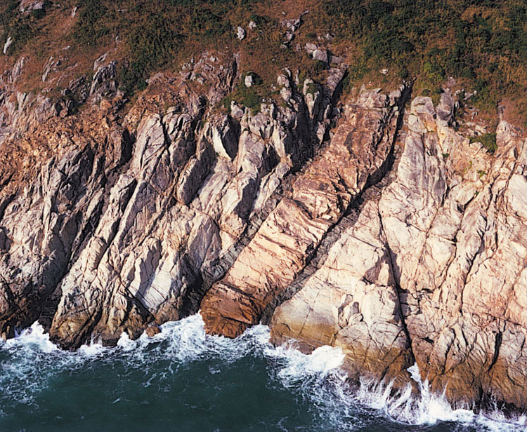 Joints are ubiquitous in the granitoid rocks and are often related to cooling and contraction. Sometimes, the joints have exploited planar foliations in the rock, such as schlieren. Two to four major subvertical joint sets are generally present in granitoids in Hong Kong. These may be accompanied by a further low-angle joint set. Low-angle sheeting joints are common, and are particularly well seen on the outlying islands (Plate 6.2). These are considered to form as a result of stress release during removal of overburden pressure (e.g. during weathering and erosion).