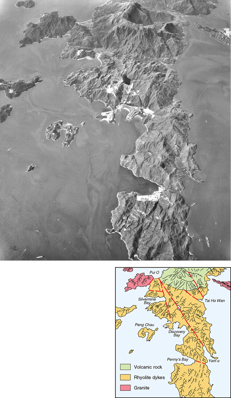 The shape and size of the intrusive bodies in Hong Kong suggests that a combination of factors controlled their emplacement. The Tai Po Granodiorite and Lamma Granite plutons are largely elliptical and their shape is controlled by the major northnortheast- to northeast-trending faults. The margins of these plutons are commonly foliated due to contemporaneous deformation. Large Z-shaped outcrop patterns for the granodiorite also suggest emplacement during a time when oblique shearing was occurring (see below). Contacts with volcanic country rocks commonly dip at a low angle suggesting that the granodiorite was partly emplaced as a series of high level sills. These are likely to be connected at depth to a larger batholithic body.