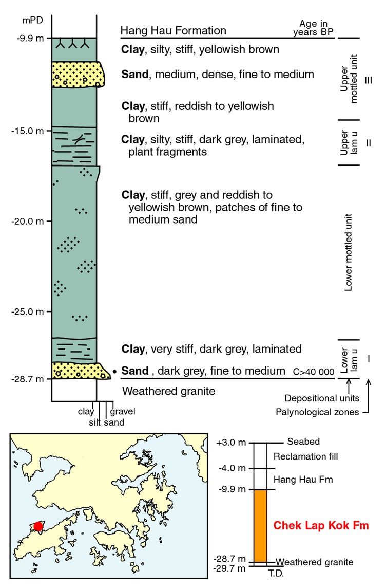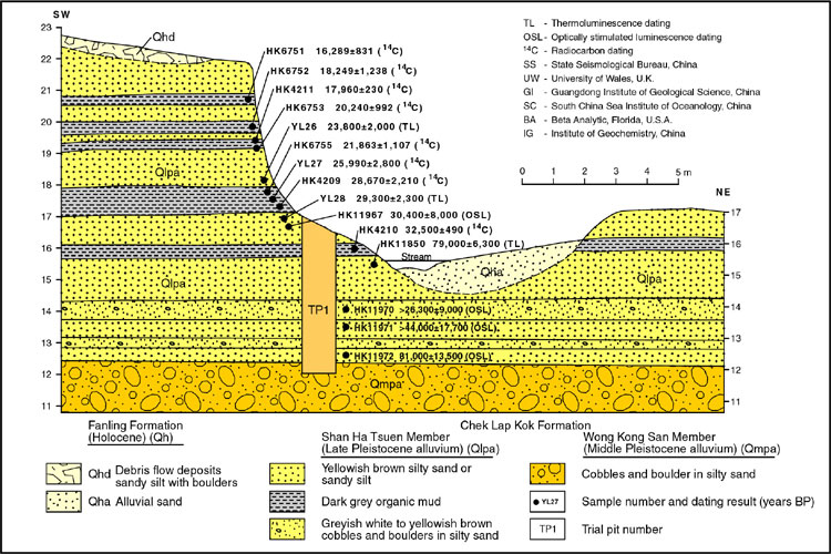 Several radiocarbon ages have been obtained from wood and peat in the formation. Radiocarbon dates obtained offshore have been reported from material from organic clay in the Shan Ha Tsuen Member at several localities in the northeast New Territories (Langford et al., 1989; Lai, 1997, 1998; Lai et al., 1996). These dates range in age from 16 289 ± 831 years BP to 33 575 ± 3 186 years BP (Beta Analytic; Guangdong Institute of Geological Sciences; South China Sea Institution of Oceanology). In addition, carbonaceous material within a colluvial deposit in a borehole (BGS 12, at 20.2 m depth) at Tin Shui Wai in the northeast New Territories, has yielded a radiocarbon age of 26 000 to 27 000 years BP (Frost, 1990).