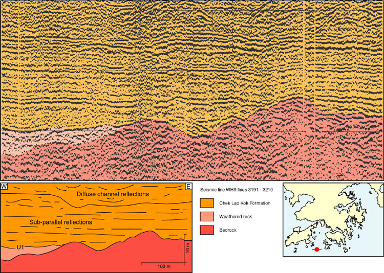 The type borehole was drilled on the Chek Lap Kok test embankment and, as a result, is not intersected by any modern seismic line. The track of a 1981 survey passes 100 m to the north of the borehole site but the record quality is poor. The units identified in the borehole cannot be traced laterally with any degree of certainty, though the formation as a whole comprises a series of parallel reflections cut by channel-like features.