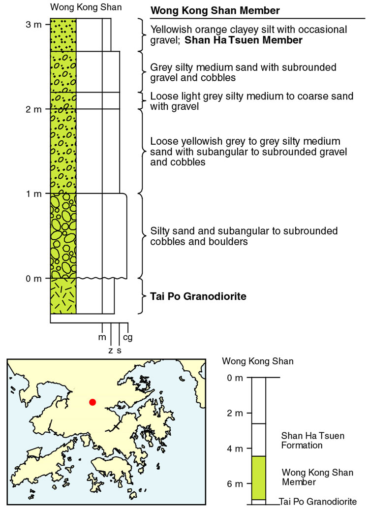 The type section of the Wong Kong Shan Member is located on the plain to the west of Wong Kong Shan (832700 838900 s-1). Here the member mainly comprises yellowish grey to mottled red and yellow silty medium sand with subangular to subrounded gravel to boulders of moderately to completely decomposed tuff, granodiorite and fresh vein quartz. The member is up to 3.7 m thick. Another section through the member is exposed at Wai Tau Tsuen (833330 836000 s-2), about 2 km northwest of Tai Po, near the junction of Lam Kam Road with the Tai Po Road (Figure 11.8). The member is mainly exposed on the second alluvial terrace at elevations between +80 and +7.4 mPD (Addison, 1986). Typically, the member comprises subrounded cobbles and boulders, up to 0.8 m in diameter, set in a mottled red, yellow and brown, clayey silty sand matrix. Individual boulders display a weathered rind up to 5 mm thick.