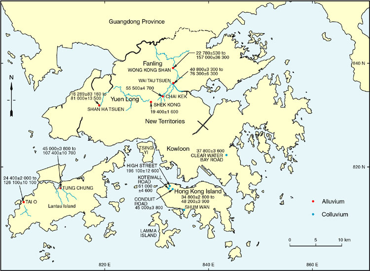 TL and OSL ages have been reported by Lai, (1998) from the Chek Lap Kok Formation in the northeastern New Territories (Figure 11.4). For the Shan Ha Tsuen Member, these ages range from TL dates of 23 800 ± 2 000 years BP (State Seismological Bureau, China) to 79 000 ± 6 300 years BP (Guangdong Institute of Geological Science). For the Wong Kong Shan Member, the dates range from 126 100 ± 10 100 years BP for a TL date (State Seismological Bureau, China) to an OSL date of 157 500 ± 36 300 years BP (University College of Wales).