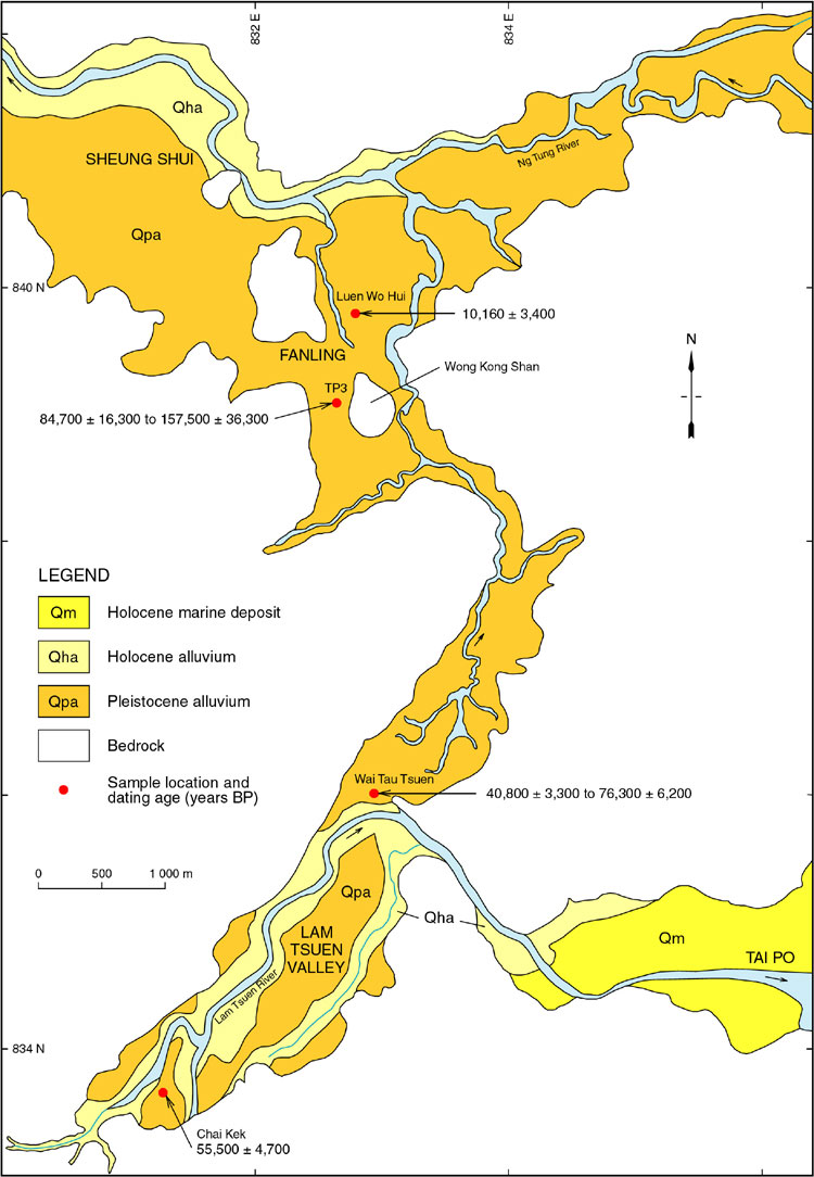 A few Pleistocene fluvial terraces are present in the eastern New Territories. Their scarcity probably reflects the generally limited extent of alluvial tracts in this part of Hong Kong. In addition, intensive agricultural terracing may have obliterated some natural terrace features (Strange et al., 1990), for example at Ho Chung.