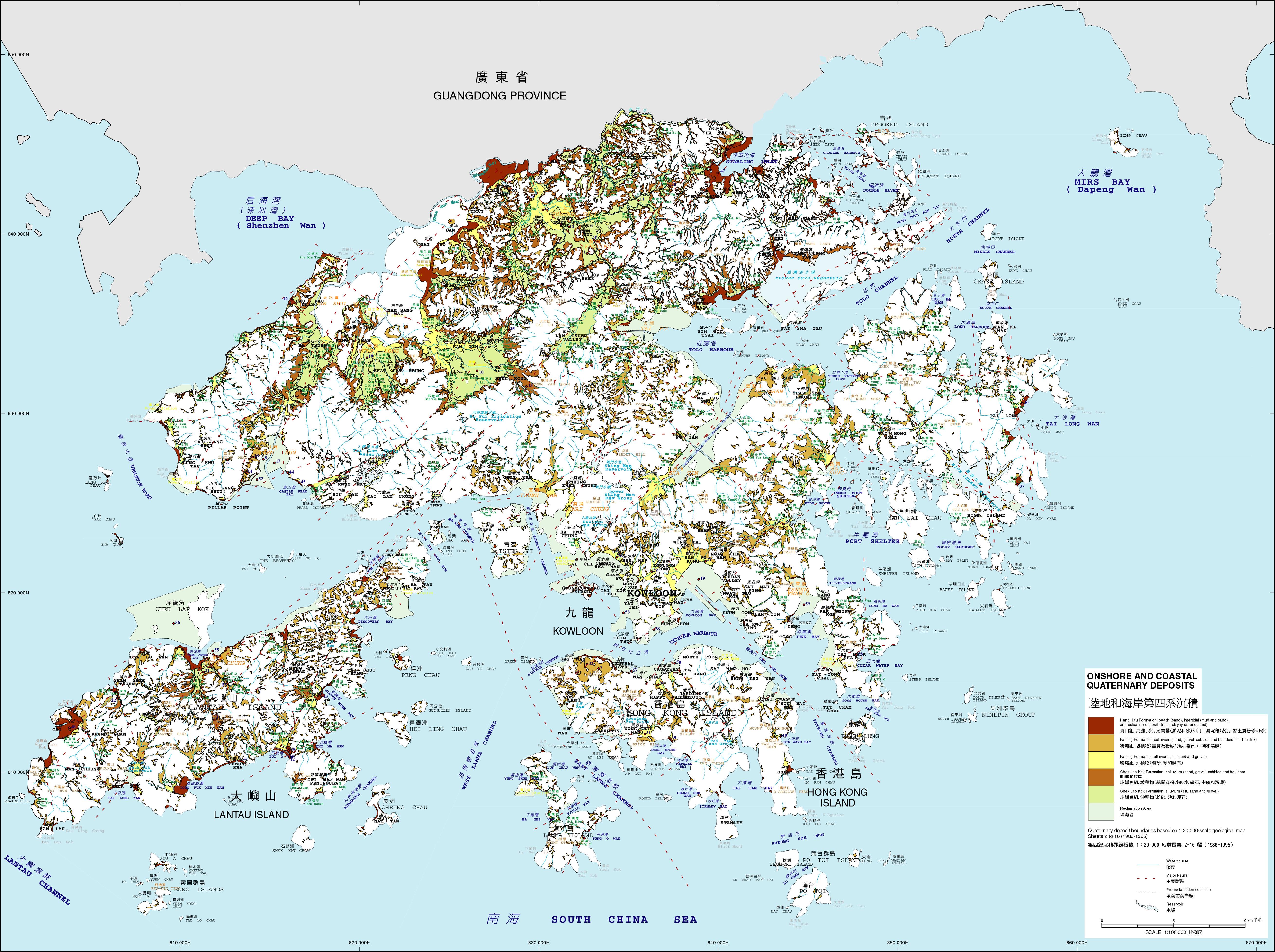 Onshore alluvial deposits of Pleistocene age, incorporated here within the Chek Lap Kok Formation, include extensive terraced alluvium in the western, northern and central parts of the New Territories. In other onshore areas of Hong Kong, Pleistocene terraced alluvium is less widespread.