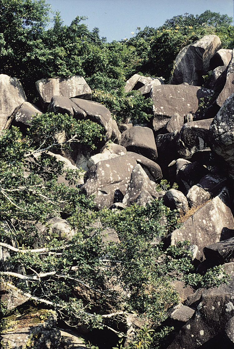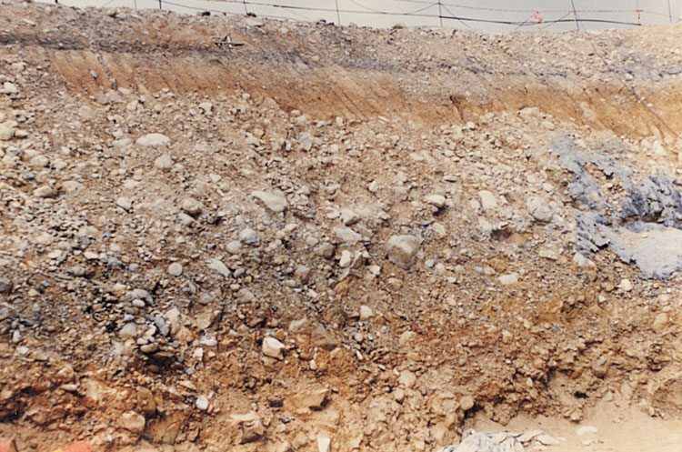 Considerable variation has been observed in the characteristics of the colluvium of Pleistocene age assigned here to the Chek Lap Kok Formation. To a large extent this reflects the lithology of the source of the deposit. In addition, variations in maximum grain size and of the ratio of coarse to fine material reflect changes in topography. Coarser debris is associated with steeper slopes and valleys (Plate 11.4).