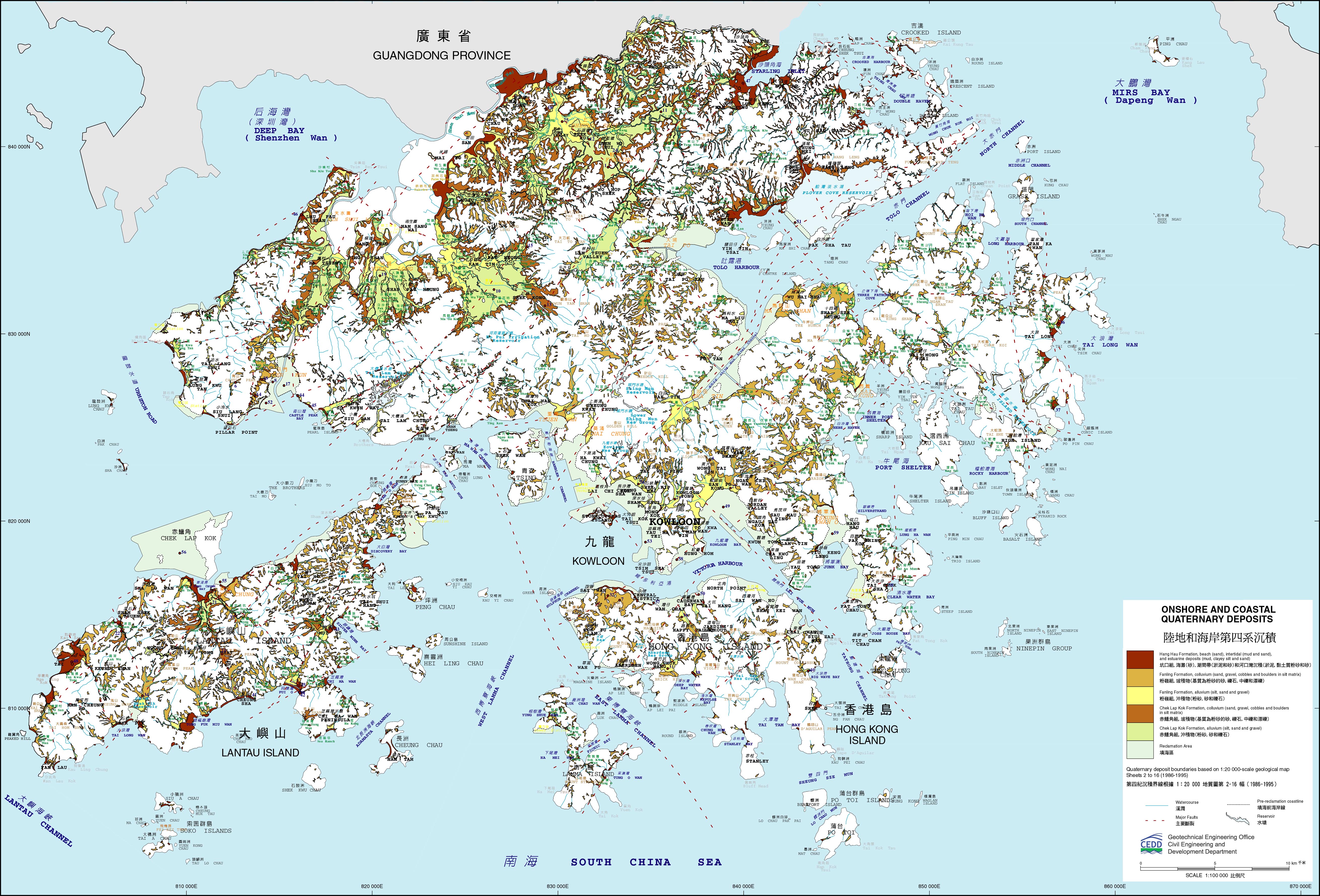 The total area of Hong Kong is 2 755 km2. This comprises 1 104 km2of land area, which represents about 40% of the total area, while the remaining 1 651 km2, some 60% of the total area, is covered by sea. About 14% of the onshore area is covered by Quaternary deposits greater than 2 m thick (Figure 11.1). These deposits are up to 50 m thick, but generally they form thin veneers, and are referred to as 'superficial deposits' on the fifteen 1:20 000-scale geological maps and in the six memoirs produced by the Hong Kong Geological Survey (HKGS). The deposits are unlithified and were formed by a variety of processes in a wide range of environments. Almost 6% (67.4 km2) of the current land area is reclaimed land (Figure 11.2). The earliest reclamation dates back to the mid-1800s.