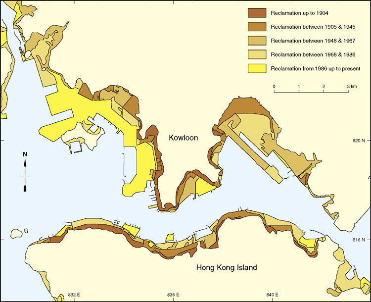 The earliest reclamations were on tidal flats in the New Territories, in particular at Sha Tau Kok, Nam Chung, Luk Keng, Shuen Wan and Yuen Long (Guilford, 1997). These were carried out primarily to create new agricultural land. Following the land auctions of 1841, small urban reclamation began around Victoria Harbour and formal waterfront reclamation commenced in 1851. By 1886, an 8 km long strip had been formed between Kennedy Town and North Point and areas of the West Kowloon waterfront had been extended. Further phases of reclamation occurred in the 1890s, the early 1900s, the 1920s and the 1950s (Guilford, 1988). By 1967, a total area of 1050 hectares had been reclaimed (Figure 11.13).
