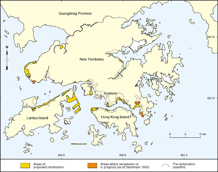 Early reclamations were, in general, confined to relatively narrow coastal strips in shallow water. More extensive reclamation into deeper water began in the 1970s. By 1991 a further 3 050 hectares had been completed, most of which was in deeper water. Between 1991 and 1995, large reclamations were constructed in connection with the new airport and related infrastructure projects. Up to 1995 a total of 6 000 hectares of land had been reclaimed (Figure 11.13 and Figure 11.14). Up to 2005, a total of 6 739 hectares of land, or approximately 6 % of the onshore area of Hong Kong, had been reclaimed (Figure 11.2).