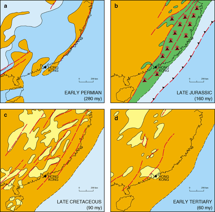 Magmatic activity in southeastern China waned in the Cretaceous as subduction, which had dominated the continental plate margin in the Middle Jurassic to Early Cretaceous period, ceased. The area remained largely emergent. Sedimentation was mainly confined to northeast-oriented, fault-controlled basins (Figure 2.6c). These were infilled with voluminous volcanic detritus from the degrading Middle Jurassic to Early Cretaceous magmatic province. Most of the preserved late Early Cretaceous and Late Cretaceous sequences in southeastern China consist of non-marine red bed successions indicating deposition under semi-arid conditions.