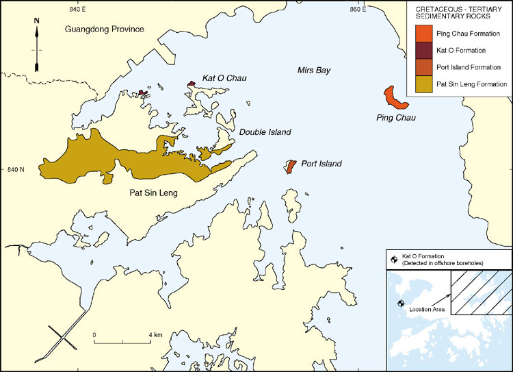 Three sedimentary basins are thought to have formed during the late Yanshanian and Himalayan orogenies. They are the Early Cretaceous Pat Sin Leng Basin, preserved mainly onshore in the northeastern New Territories, and the Late Cretaceous Tai Pang Wan and Ap Chau basins, both of which are preserved largely offshore in Mirs Bay (Figure 8.6). The Early Tertiary Ping Chau Formation overlies the Late Cretaceous sedimentary rocks of the Tai Pang Wan Basin without any marked stratigraphic break.