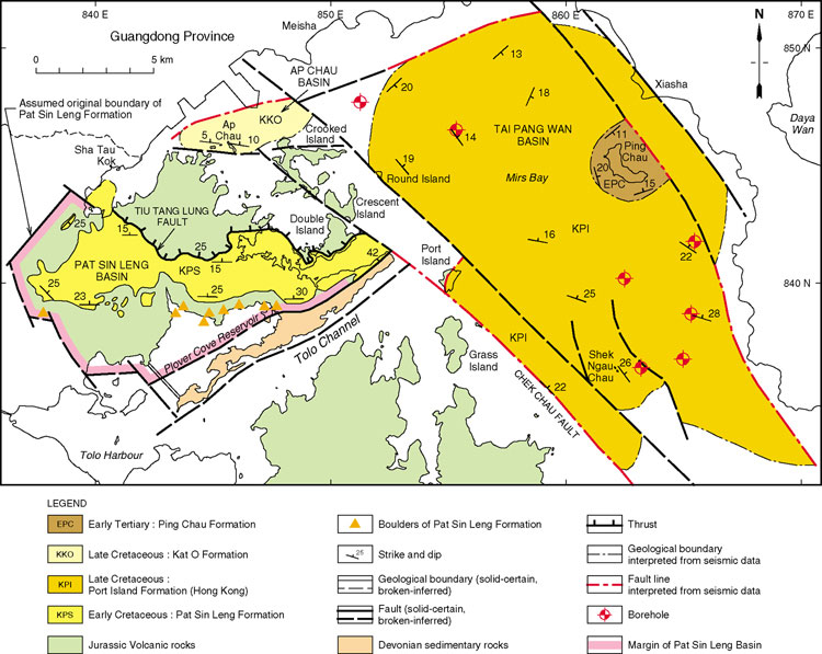 The basin is bounded by faults. The southern boundary occurs along a fault stretching westerly from Bluff Head to Siu Kau, Wong Leng and beyond. The Sha Tau Kok Fault truncates the basin on its western side with some isolated outcrops of the Pat Sin Leng Formation occurring within the fault zone. On the north side of the basin, the Pat Sin Leng Formation is overlain along the Tiu Tang Lung Fault by the Late Jurassic Tai Mo Shan Formation (Figure 8.6). The orientation of the Pat Sin Leng Basin in relation to the thrust suggests that it may have been a foreland basin formed during north-south compression and sinistral strike-slip (transpression) on northeast-trending faults