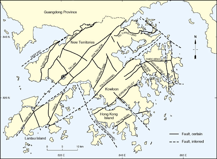 The compositions, geometries and structural histories of the faults in Hong Kong are variable and complex (Lai & Langford, 1996). Due to the lack of exposure in most fault zones, it has been impossible to characterise them comprehensively. Notable exceptions include complete sections through the northeast-trending Tolo Channel Fault near Sha Tin and the northnorthwest-trending 'Rambler Channel fault' between Tsing Yi and Stonecutters Island. These are described in detail below and are considered to be typical of many faults in Hong Kong.