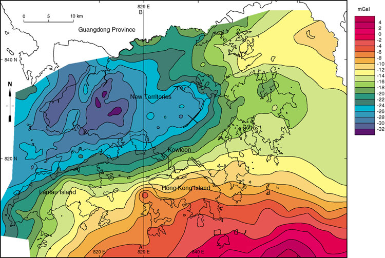 The regional Bouguer gravity anomaly map of Hong Kong (Electronic & Geophysical Services Ltd (EGS), 1991; Busby et al., 1992) (Figure 9.1) displays a steep southeast-trending gradient. This is evident to the southeast of a line extending from Sai Kung in the northeast, through Kowloon to Lantau Island in the southwest. The lowest Bouguer gravity anomaly values, of less than 30 mGal, occur to the south and west of Yuen Long. Values remain below 20 mGal throughout most of the New Territories. Gravity values increase to the southeast and reach a maximum of 5 mGal approximately 15 km to the southeast of Hong Kong Island. There is also a more gradual increase in gravity values towards Mirs Bay in the northeast.