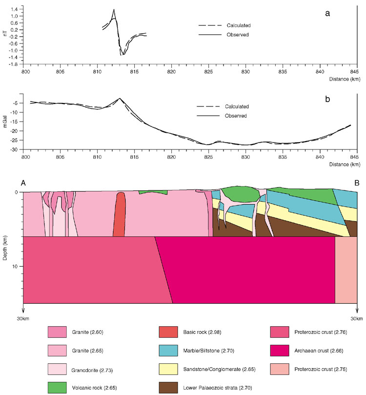 A geological cross-section through the crust has been derived from modelling of the gravity data along grid line 829 E and using data from the existing geological maps (Figure 9.2; Fletcher et al., 1997). The best-fit model for the gravity data consists of a 25 km-wide crustal segment with a density of 2.66 Mg m -3, flanked by blocks with higher densities of 2.76 Mg m -3 to the south and 2.75 Mg m -3 to the north. These densities are consistent with a felsic Archaean crust separating denser blocks of mafic Proterozoic crust. The long-wavelength gravity anomalies, and in particular the southeast-trending gradient that cuts across Hong Kong, appear to result from fundamental discontinuities in the middle and lower crust (6–8 km deep).