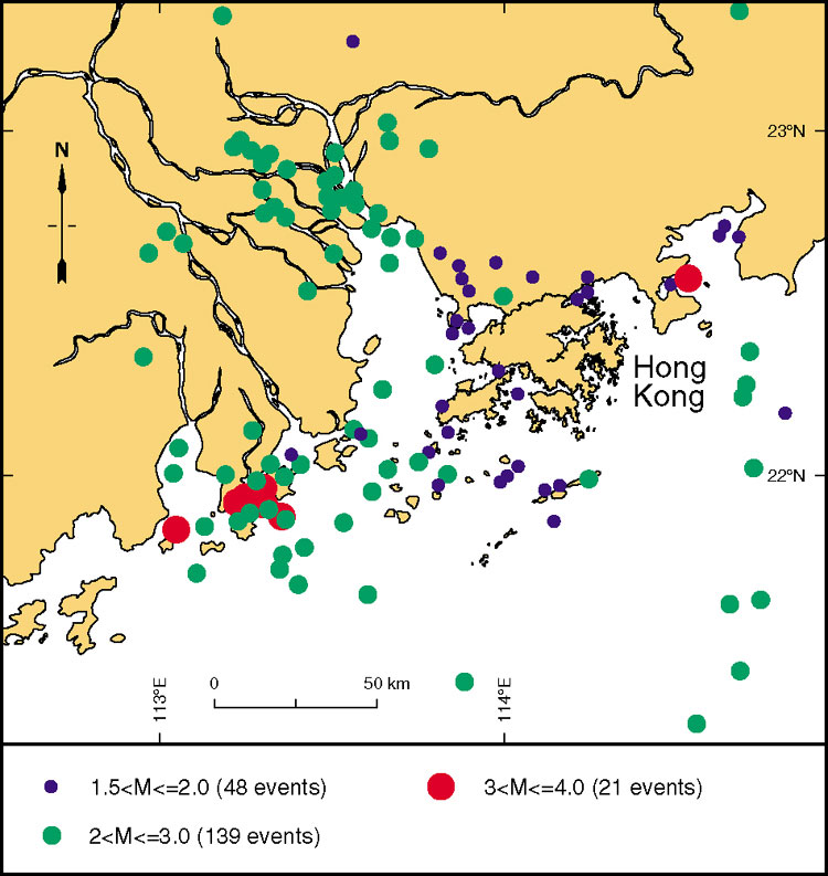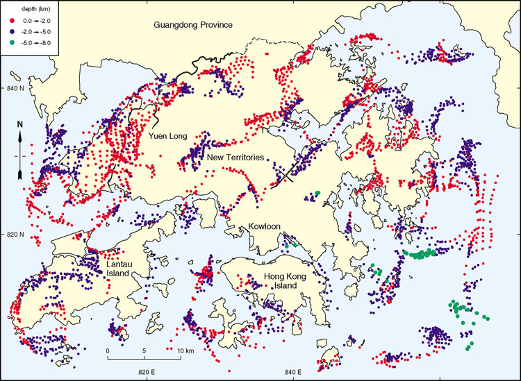 Microseismic activity in the Hong Kong region has been monitored more accurately by the Hong Kong Observatory since mid-1997, and a summary of the events recorded during 1998 is shown in Figure 9.14. Most of the events are located within the estuary of the Pearl River and, although relatively diffuse, possible northeast-trending linear arrays are apparent.