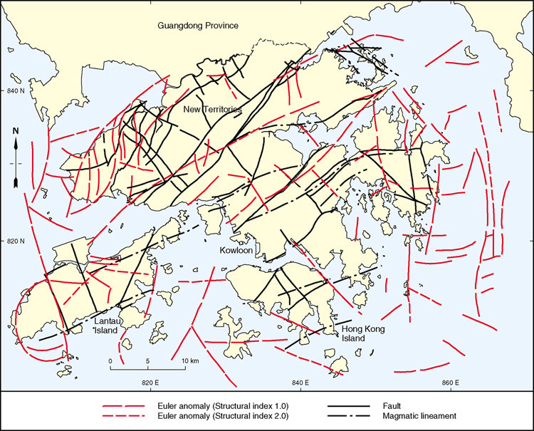 Euler solutions calculated from the data set for Hong Kong form linear, arcuate and sigmoidal Euler anomalies (Figure 9.3) and have 'solution depths' in the range of 1 to 8 km. The linear anomalies generally vary between 2 and 10 km in length, and are up to 500 m wide. They are considered to represent faults in the upper crust and the uppermost part of the middle crust. Four main sets of subparallel linear anomalies are recognized: a northeast-trending set, more prevalent and continuous in the northwest of Hong Kong; a north-trending set, generally restricted to eastern and western offshore areas; a northwest-trending set, forming short anomalies in the central part of Hong Kong; and an east-trending set concentrated between the north-trending anomalies in eastern offshore areas.