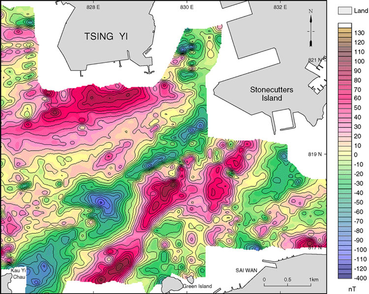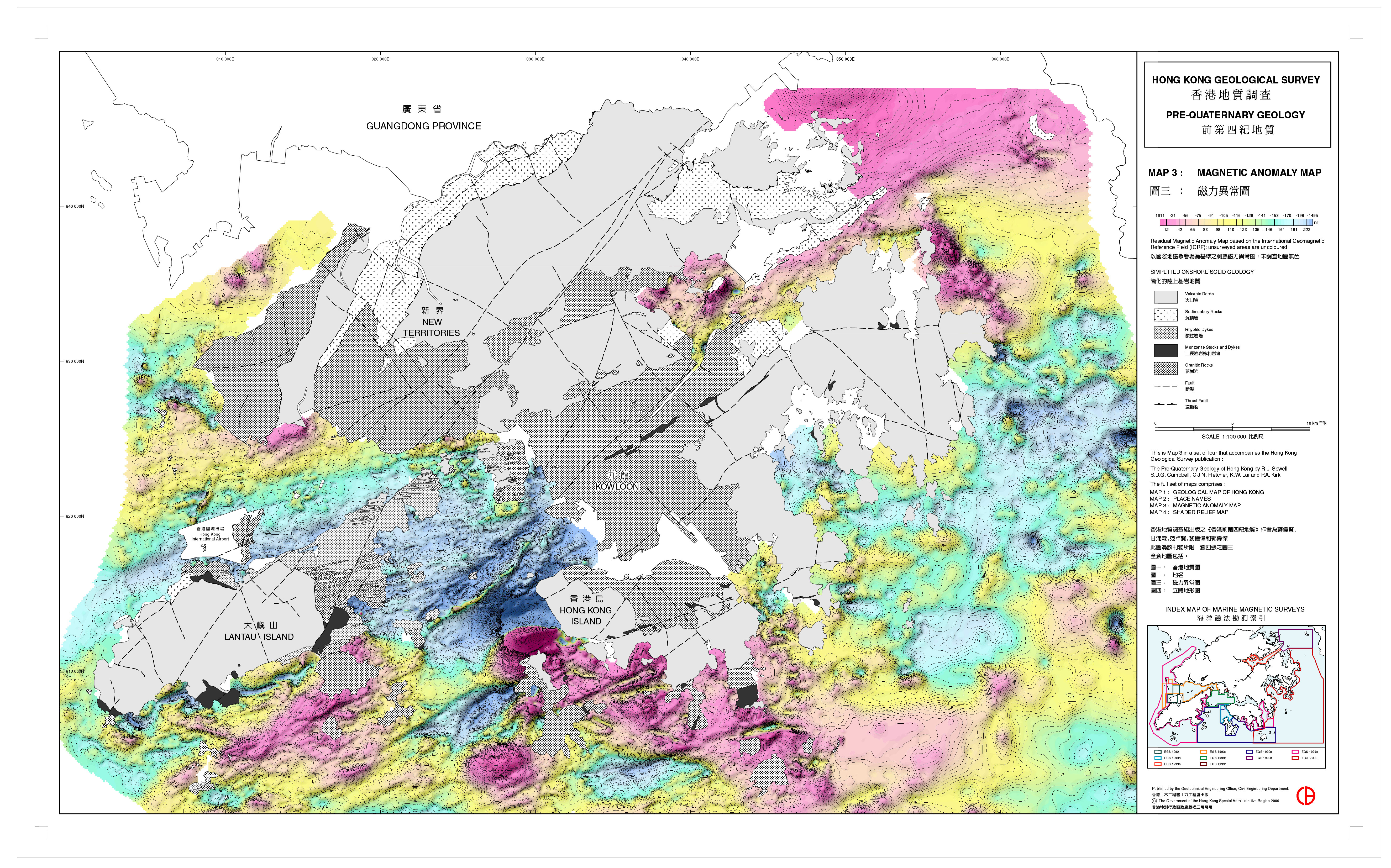 - Offset of magnetic anomalies by c.3 km in the offshore area southwest of Lantau Island.