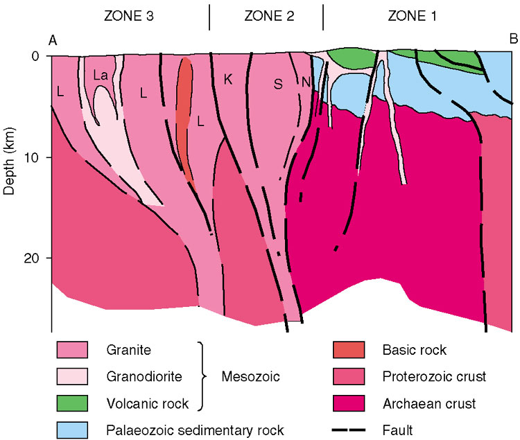 (Darbyshire & Sewell, 1997; Sewell & Campbell, 1997). The crustal discontinuity between the Archaean and Proterozoic terranes acted as a conduit for mantle-derived magmas that were intruded into the upper crust (Chapter 7). Transtension probably occurred in the upper crust above the discontinuity periodically throughout the Late Jurassic and Early Cretaceous. This was expressed by the intrusion of elongate granite plutons, development of calderas and emplacement of wide dyke complexes (Campbell & Sewell, 1997).