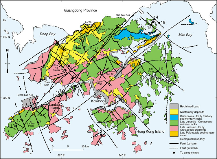 The youngest rocks exposed in Hong Kong are Early Tertiary in age. These, together with the older rocks, all display evidence of deformational events that were most probably related to fault movements. However, there is no direct evidence of fault displacements in either the offshore or onshore Quaternary superficial deposits that overlie in situ material. In particular, no displacements have been identified from the many hundreds of kilometres of offshore seismic lines of Quaternary offshore alluvial and marine sequences, and no onshore colluvial wedges are considered to have formed adjacent to recently active fault scarps. Thus, it has been necessary to resort to thermoluminescence (TL), optically stimulated luminescence (OSL) and carbon isotopes (C14) to date any recent fault movements.