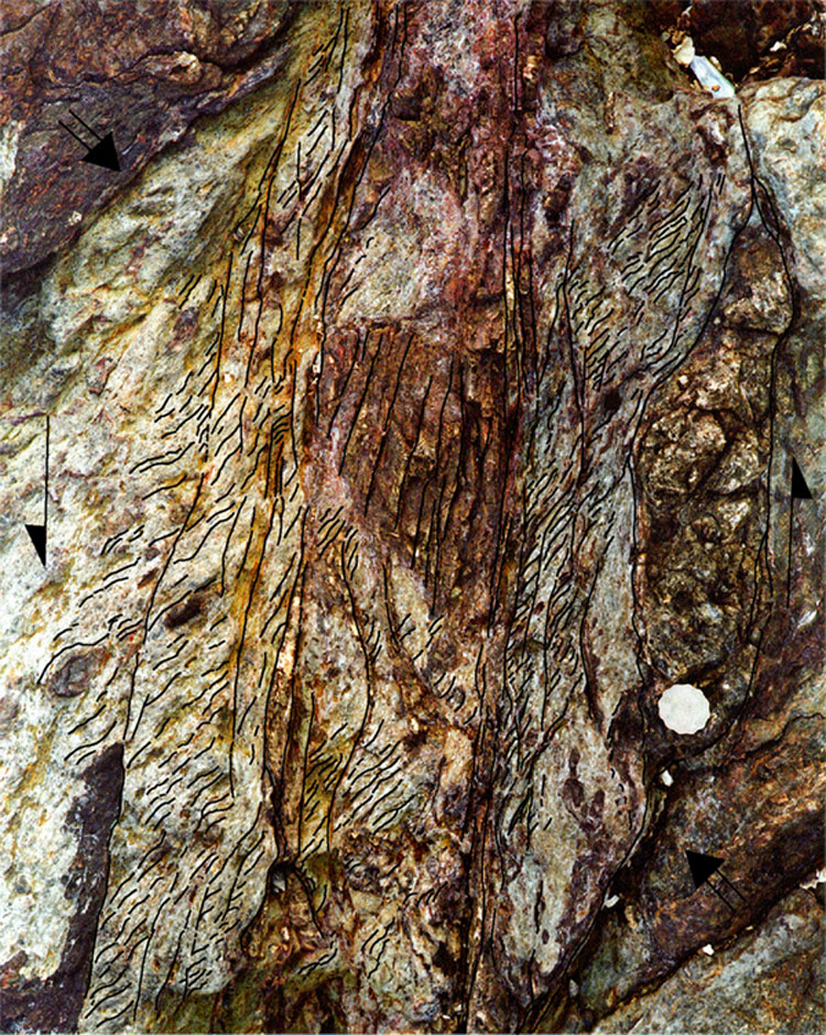 - Possible sinistral offsets of granitic contacts and of the outcrop of Permian rocks on either side of the Tolo Channel Fault by between 1.2 and 2.2 km. This interpretation is supplemented by outcrop scale observations of S–C relationship and absolute offset of quartz veins indicating sinistral movement at Nai Chung Pier, Fung Wang Wat and elsewhere.