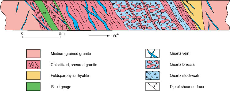 The 'Rambler Channel fault' was recently exposed in a deep offshore tunnel between Tsing Yi and Stonecutters Island. There, the fault displaces medium-grained granite of the Sha Tin Pluton and truncates a feldsparphryic rhyolite dyke belonging to the Lantau Dyke Swarm. The fault zone, which is approximately 20 m wide and dips steeply to the east, displays evidence of several episodes of brittle, brittle–ductile, and ductile deformation. These styles of deformation are manifested by zones of quartz breccia and fault gouge, sheared granite with quartz lenses, and mylonitic granite with S–C fabrics respectively (Figure 9.9). The western margin of the fault zone is gradational over several metres, from an undeformed medium-grained granite with a few thin quartz veins to an intensely sheared and chloritized granite adjacent to a 1 m-thick fault gouge. S–C fabrics indicate that reverse and left-lateral displacements, or an oblique combination of the two, have occurred. The brittle style of deformation, mainly confined to the eastern part of the fault zone, consists of a thick stockwork of multiphase quartz veins within altered granite. The stockwork is cut by a few thin mylonitic shears. Close to the eastern margin of the fault zone, a 1.5 m-thick quartz breccia, consisting of angular fragments of white quartz set in a black cryptocrystalline quartz matrix, is flanked by well-defined layers of intensely sheared granite. Undeformed granite and feldsparphyric rhyolite, which are both cut by sets of thin quartz veins, form the hanging wall of the fault zone.
