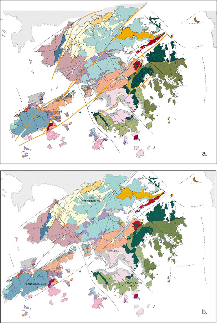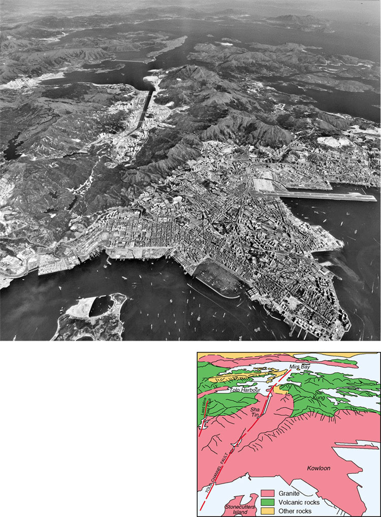 The framework of known and inferred faults in Hong Kong is shown in Figure 9.7. In most instances, faults are poorly exposed and they often underlie superficial deposits. The published 1:20 000-scale geological maps show faults only in areas of solid geology and do not show their concealed traces beneath areas of superficial deposits, although these can often be inferred with reasonable confidence. The faults are typically zones of deeper weathering penetration and enhanced erosion (Plate 9.1). Therefore, they usually form linear topographic depressions. These in turn are exploited by surface and shallow subsurface drainage, further enhancing processes of weathering and erosion along these zones and subsequent deposition of Quaternary superficial deposits (see Fyfe et al., 2000).