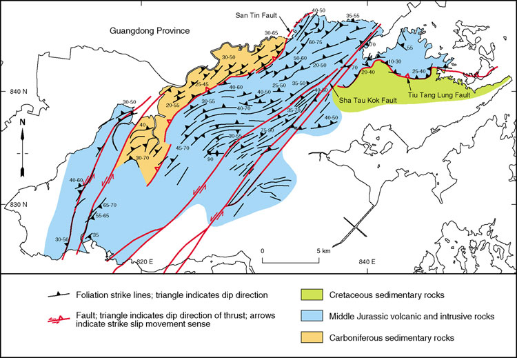 Two major thrust faults have been identified, the San Tin Fault in the northwestern New Territories and the Tiu Tang Lung Fault (Figure 9.11) in the northeastern New Territories. Both structures dip at low to moderate angle, the former towards the northwest and the latter towards the north. Recent Ar–Ar age dating of whole rock specimens (GEO, unpublished data) suggest that their main phase of activity was between 60 and 90 Ma, during the Late Cretaceous.