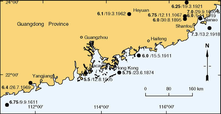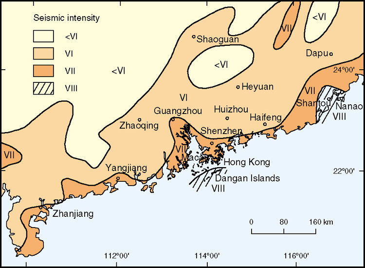 Recent fault movements in southeast China, as determined by the intensity of seismic activity, are generally concentrated along the coastal areas (Figure 9.12) and are due mainly to the interaction of the Eurasian and Philippine plates (Figure 2.2). Hong Kong is considered to lie in a region of moderate seismicity (State Seismological Bureau, 1990), although it has never experienced a major earthquake in recorded history. However, over the last 1000 years there have been more than 40 recorded earthquakes with magnitudes greater than 4.75 within a distance of 350 km of Hong Kong (Ding & Guo, 1989; GCO, 1991b, Pun & Ambraseys, 1992; Whittaker et al., 1992; Lee & Workman, 1996). Of these, eleven had magnitudes greater than 6.0 (Figure 9.13). The recorded earthquakes closest to Hong Kong have been: the Ms 6.0 event in Honghai Bay (85 km east of Hong Kong) on May 15, 1991; the Ms 5.5 event near Macau on August 12, 1905; and the Ms 5.75 event near the Dangan Islands on June 23, 1874. These, and other smaller events, are considered to be mainly related to displacements on either northeast-trending faults, including, for example, the fault close to the Dangan Islands (Figure 9.12), or northwest-trending faults, some of which define the margins of the Pearl River Tertiary sedimentary basin (Ding & Lai, 1997).
