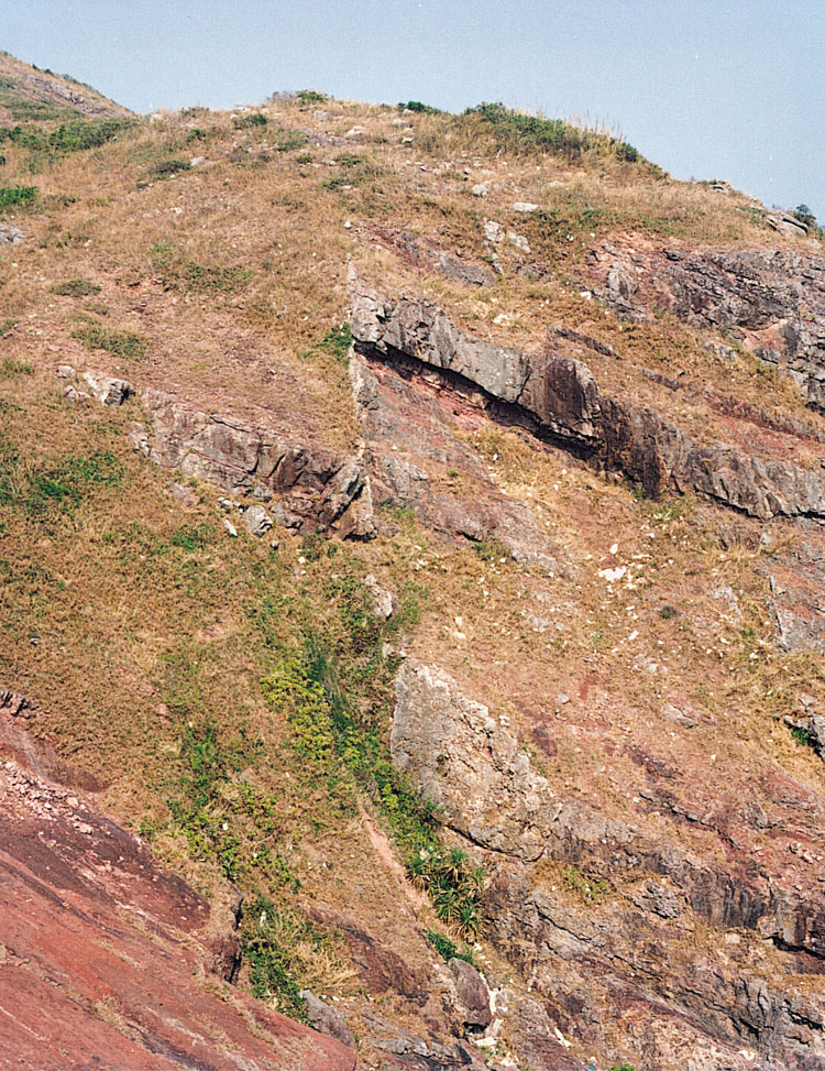 - Offset of feldsparphyric rhyolite dykes in east Lantau Island and of the linear outcrop of volcanic rocks on the northern side of Lantau Island, suggesting sinistral offset of c.1.2 km along a subparallel splay of the same fault.