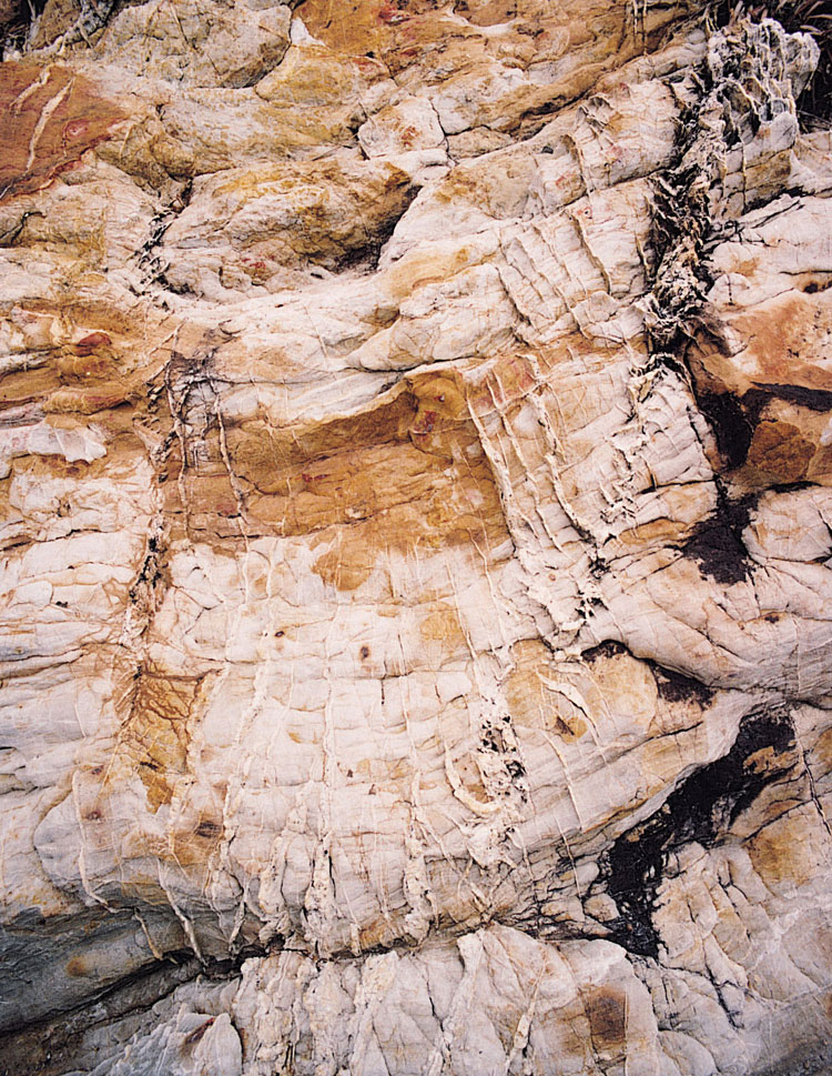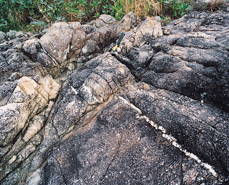 Stress relief joints are common. They are variably planar to shallowly concave upwards, and are subhorizontal or moderately inclined. Many, but not all, are subparallel to the local natural terrain. They may be associated with zones of subparallel exfoliation up to tens of millimetres wide. These zones may extend laterally for metres and even tens of metres. Kaolin and manganiferous minerals commonly occur in these zones, especially near the weathering front (Fyfe et al., 2000). Groundwater flow is especially common along these zones.