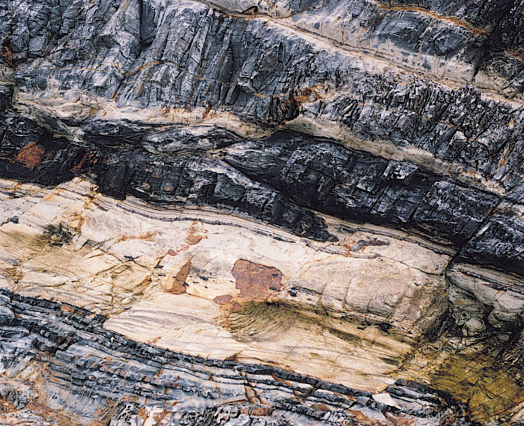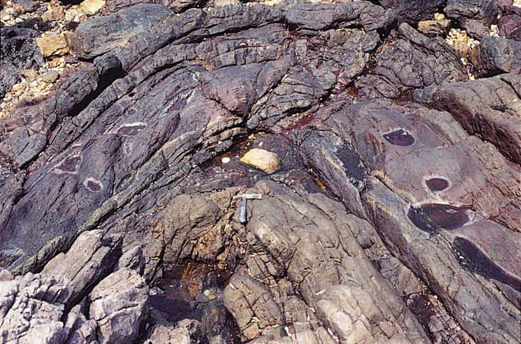 Folds within the Jurassic and Cretaceous volcanic formations, including the interbedded sedimentary units, are typically open. Although the volcanic formations are often poorly stratified, the orientation of eutaxitic foliation, within several of the formations commonly provides a good general indication of the dip of the rocks. However, on a local scale, eutaxitic foliation often displays evidence of disturbance due to rheomorphism (secondary flow at the time of deposition) that can produce complex fold patterns that do not relate to the overall dip of the rocks.