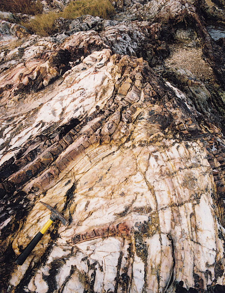 Minor intraformational faults that are broadly syn-depositional, are commonly identified in the Jurassic and Cretaceous formations. This is especially so within the mainly epiclastic horizons that occur within the Late Jurassic to Early Cretaceous volcanic succession. The best example of this style of deformation is in the Lai Chi Chong Formation (Plate 9.7) on the south side of Tolo Channel. Here, a wide variety of faults are associated with soft sediment folding and dewatering of the well-bedded mudstone, siltstone, sandstone and tuff succession. Low-angle, northeast-dipping thrust-like faults are common in association with tight to recumbent folds. Conjugate extensional faults are also well developed, sometimes with related hydraulic breccias.