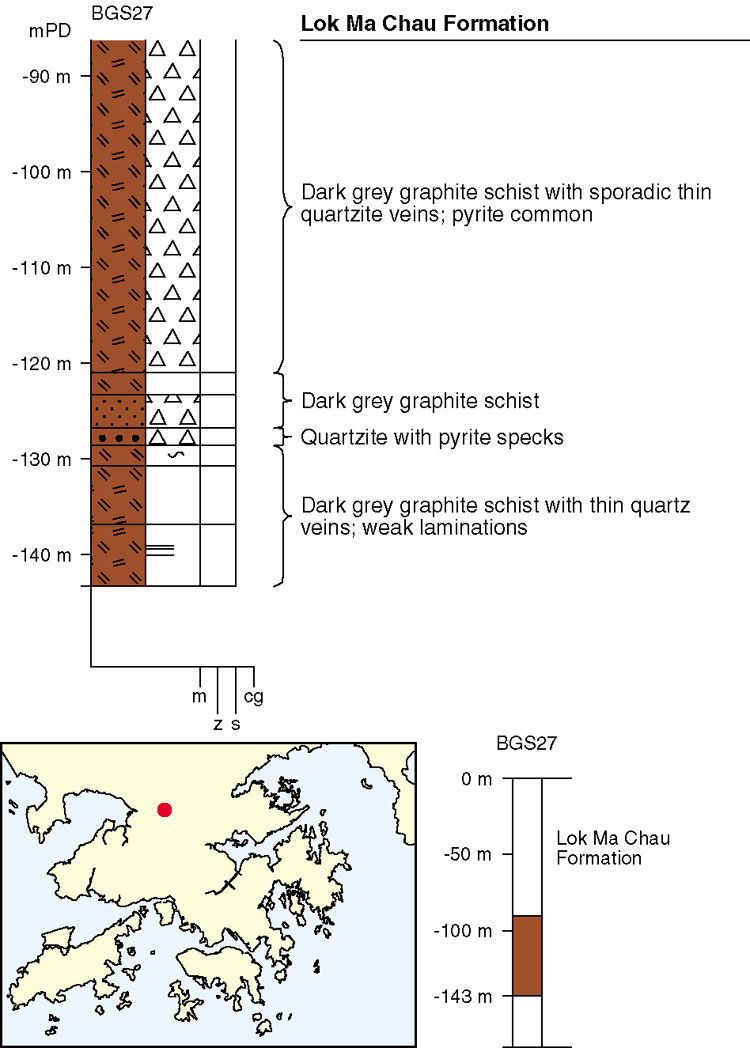 The Lok Ma Chau Formation has been divided into the lower Mai Po Member, comprising dominantly metamorphosed siltstone with fine grained sandstone and carbonaceous siltstone and the upper Tai Shek Mo Member, which is a coarser grained facies of metamorphosed sandstone with conglomerate (Langford et al., 1989). The type section of the Lok Ma Chau Formation is designated here as Borehole BGS27 from the Yuen Long area (Figure 3.11).