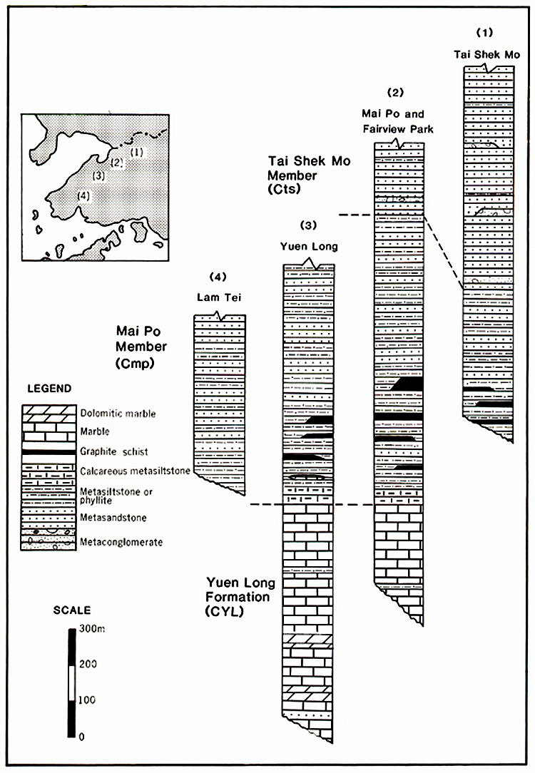 An isolated exposure of the Mai Po Member, surrounded by superficial deposits, can be seen at Tam Kon Chau (823300 839400 Csl-18). The strata comprise greenish grey phyllite with greyish white metasandstone, white thick-bedded quartzite and graphite schist. Between 1966 and 1974, six boreholes and two shafts were sunk to investigate the graphite at Tam Kon Chau. At least four layers of graphite schist were found, varying in thickness from 1 to 12 m. The deepest borehole (220 m) failed to penetrate the base of the Mai Po Member.