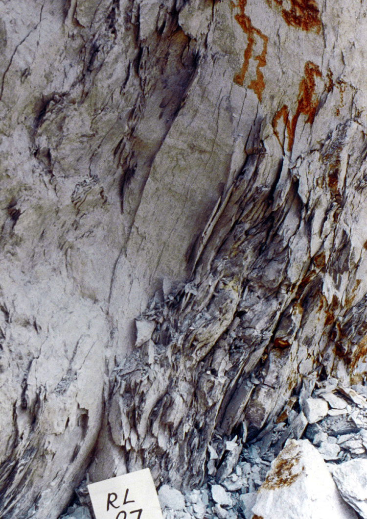 Kong Nga Po to Lo Shue Ling. All the rocks in this area are metamorphosed, and quartzphyric rhyolite dykes trending 020o that intrude the formation are also foliated. A thin bed of graphitic schist occurs at Kong Nga Po HK6935 (831860 842880 Csl-42), but the main lithology is phyllite. The outcrop of the formation continues northeast across the Sham Chun River into Shenzhen. At Kong Nga Po, Borehole SL3/6 GIU report no. 6681 (831920 842910 Csl-43) penetrates metasiltstone (HK3417) overlying mylonitised tuff (HK3418) of the Tai Mo Shan Formation. The contact at 13 m is interpreted as a thrust, with the overlying rocks thrust from northwest to southeast.