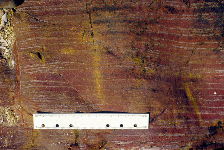 East Brother (prior to development). The island is dominated by red-weathering, finely laminated siltstone and sandstone (Plate 3.A6, massive siltstone and fine-grained sandstone. Thin quartzitic sandstone beds at the southern end of the island are less than 2 m thick. Quartzitic sandstone also occurs at the northern end, and may be partly responsible for the hog-back appearance of the island. Well-defined bedding dips steeply on the west coast of the island, and can also be seen occasionally on the east coast in the more massive siltstone and silty sandstone. The succession is at least 100 m thick, but no top or base has been observed.