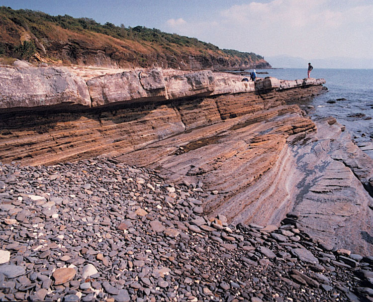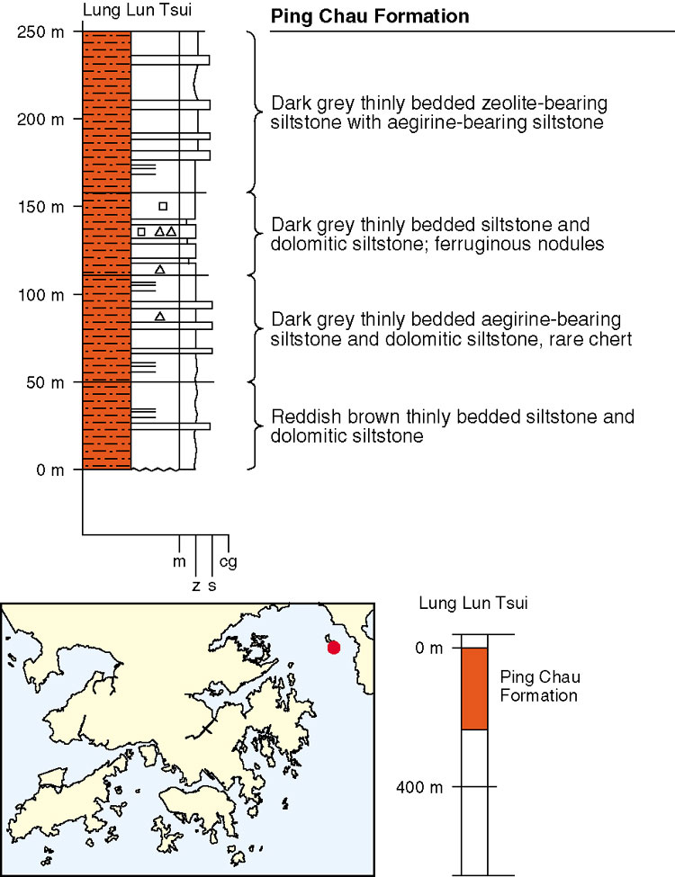 The Ping Chau Formation comprises a gently (10–20º) northeastward-dipping succession of thinly-bedded dolomitic and calcareous siltstones with rare chert interbeds (Plate 8.6). The upper and lower contacts are not exposed and the formation has a minimum thickness of 450 m. Lai et al. (1996) have divided the Ping Chau Formation into three members. The lower and upper members are composed predominantly of thinly-bedded siltstone and dolomitic siltstone and mudstone. The middle member consists chiefly of dark grey, thinly- bedded aegirine- and zeolite-bearing siltstone with interbedded dolomitic siltstone and mudstone. The middle member has been further subdivided into three units, the lower unit comprising thinly-bedded aegirine-bearing siltstone with dolomitic siltstone and a layer of chert, the middle unit consisting of thinly-bedded siltstone with mudstone, and the upper unit consisting of thinly-bedded zeolite-bearing siltstone with aegirine-bearing siltstone. The designated type section is between Lung Lun Tsui and Wong Ye Kok (Figure 8.5).