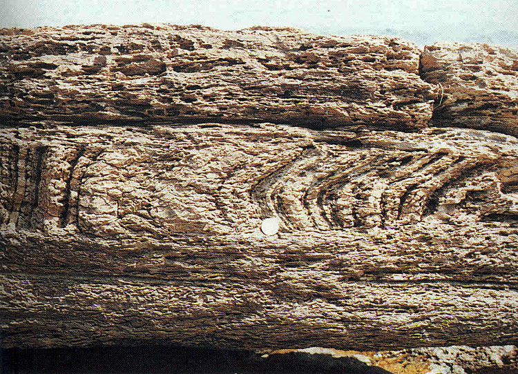 The middle part of the member is 46 m thick, and comprises dark grey, thinly bedded siltstone with intercalated dolomitic siltstone and mudstone. Laminae within each of the siltstone beds are also very thin but contain more detrital minerals. Pyrite is abundant, ranging in size from 0.1 mm cubic crystals to 120 mm nodules. Shrinkage cracks, cross-bedding, rain pitting prints and trace fossils are present in the rocks, and fossil plants are also abundant. A fossil palm leaf, 60 cm long and 50 cm wide, occurs at Nan Kwo Shui (863380 844450 Ep-7)