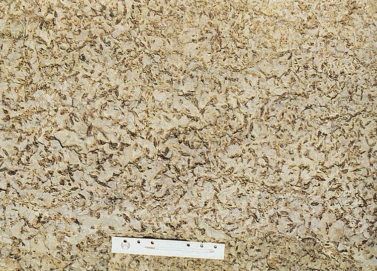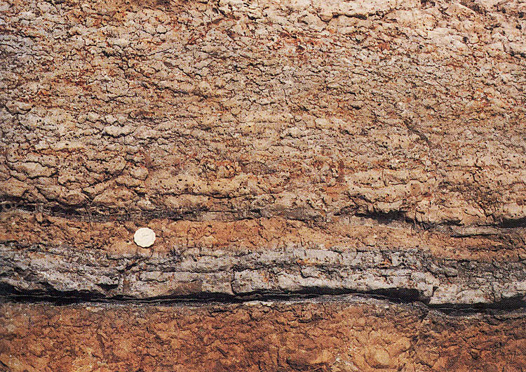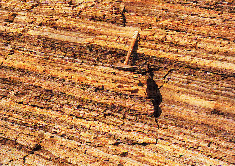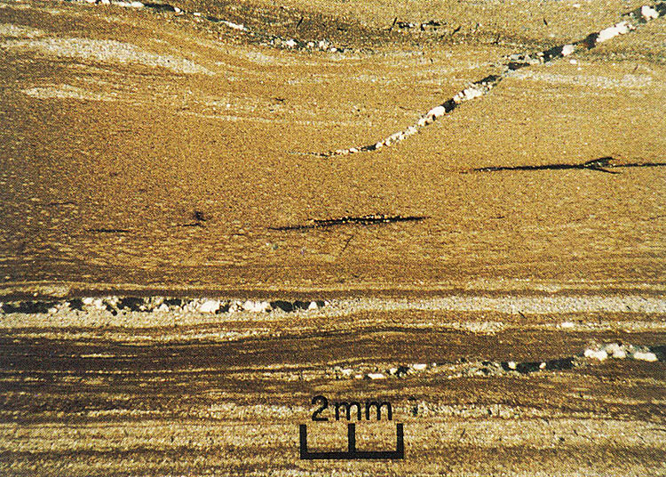 The Ping Chau Formation is typically characterised by thinly-bedded strata. Individual beds are only 20 to 60 mm thick and can be traced laterally for up to 100 m. The beds are mostly composed of thin, alternating planar laminae formed from detrital or chemical sedimentary rocks. Aegirine, calcite and zeolite crystals occur locally on some horizons and are possible pseudomorphs of gypsum. Carbonaceous fragments, which are abundant on many bedding planes, represent bitumunized plant fragments. Sedimentary structures include low-angle cross lamination, ripple marks, raindrop impressions, and load structures. Multiple thin, recumbent, slump folds and pyrite and limonite concretions are also common throughout the succession. Zeolite, in the form of natrolite and analcime, is found abundantly as rosette-shaped crystal aggregates on bedding planes. Rare bands of chert (up to 1.2 m thick) are present in the succession, the most prominent of which occurs at Lung Lun Tsui (Plate 8.7) on the western coast of Ping Chau.
