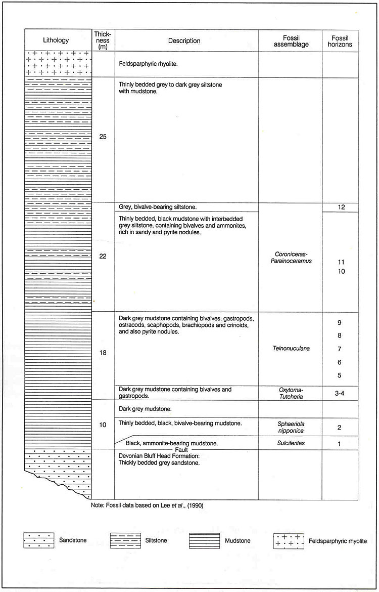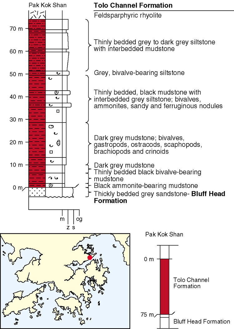 The Tolo Channel Formation dominantly consists of grey to greyish white, laminated siltstones with rare sandy lenses alternating with thinly-bedded fossiliferous black mudstone containing pyritous nodules. At the type locality, 1 km northeast of Fung Wong Wat, the strata dip moderately (c. 60o) to the northwest although fossil evidence indicates they are overturned. The formation has an exposed thickness of 75 m and is faulted at its base against the Bluff Head Formation. The top of the formation is not exposed. A composite type section from the north side of Tolo Channel, where the formation was first recognized, is shown in Figure 4.2.