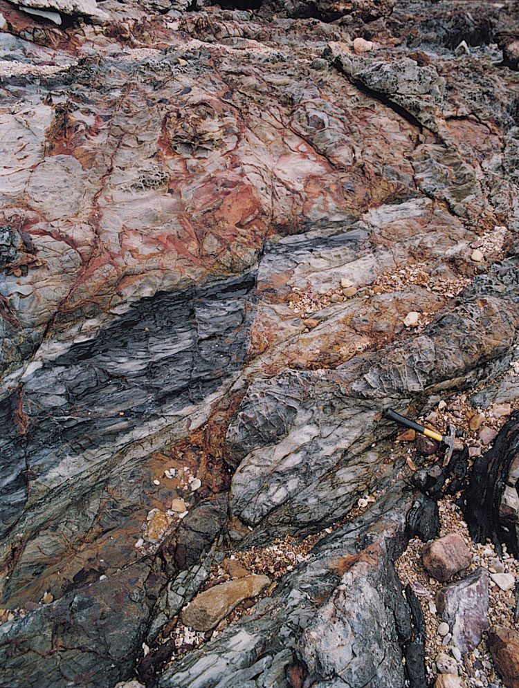 At Nai Chung, the Tolo Channel Formation strata are highly contorted and comprise highly cleaved, coarsely laminated siltstone alternating with finely laminated fossiliferous mudstone (Plate 4.1). At Ma Shi Chau, the strata consist of pinkish brown weathered, laminated micaceous siltstone and dip steeply to the west. They have yielded an ammonite fossil indicating a Jurassic age (Lam, 1973).