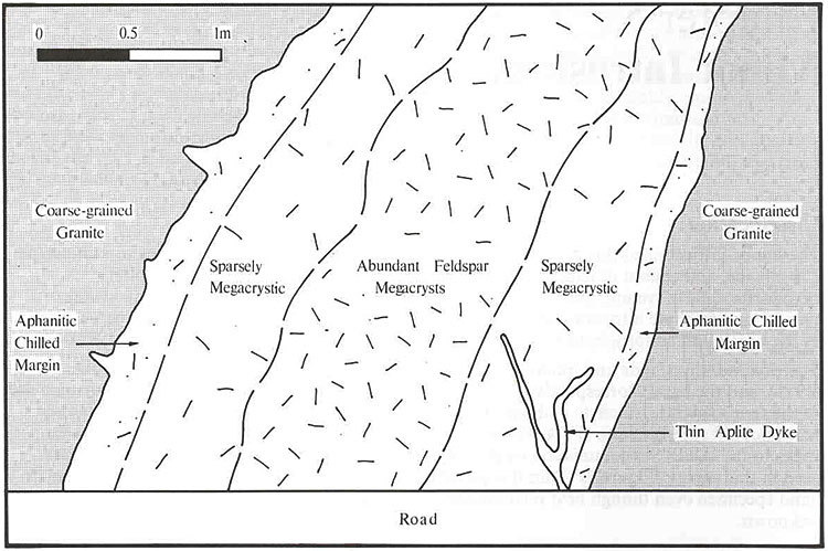 Siu Ho Wan. Along the coast west of Siu Ho Wan, there are several good exposures of younger feldsparphyric rhyolite dykes chilled against older dykes. In addition, textural gradations occur between light grey feldsparphyric rhyolite, with phenocrysts of feldspar up to 20 mm long, and porphyritic microgranite, with a fine-grained groundmass and phenocrysts of less than 10 mm.