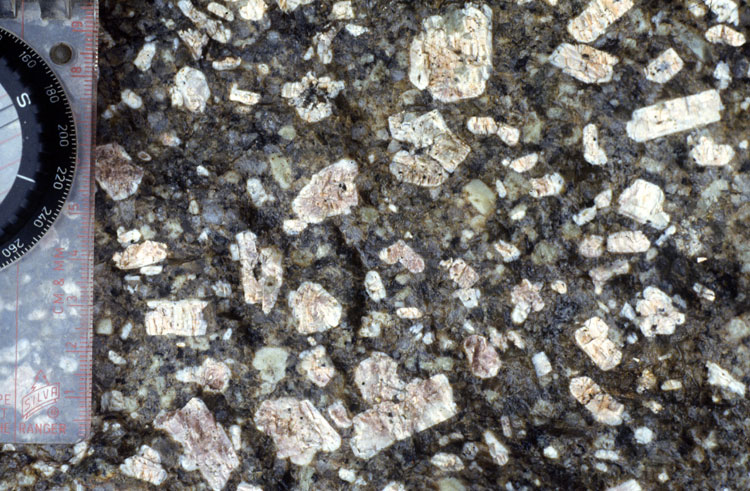 Feldsparphyric rhyolite is exposed in coastal sections south of Kwo Lo Wan, where two small dykes, 0.5 and 3 m wide, contain feldspars only up to 3 mm long. Similar dykes, closer to a quartzphyric rhyolite dyke swarm, have small but prominent feldspars. Abundant boulders of feldsparphyric rhyolite with larger megacrysts (around 20 mm), occur on the beach south of Ha Law Wan, and similar corestones are evident on the adjacent hillside.
