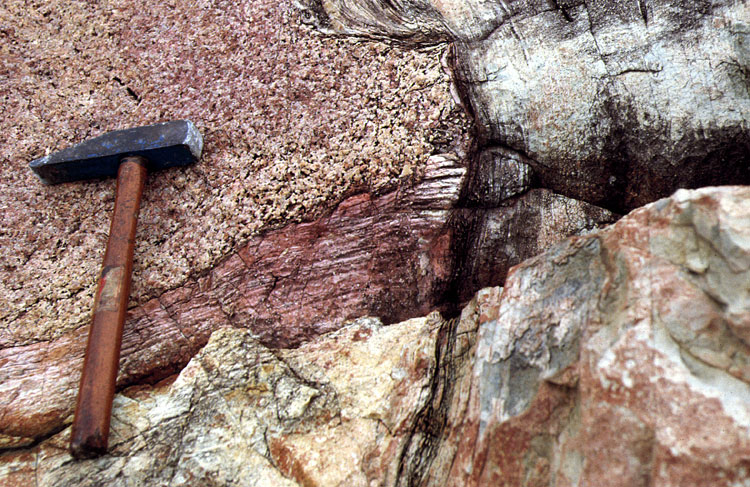 At Pak Sha Tsui, there are extensive exposures (811000 816900 Jko-12) of quartzphyric rhyolite which include several slivers of granite country rock adjacent to the flow-banded margins. These exposures probably form part of a multiple dyke swarm, up to 150 m wide. Most contacts with the granite are very irregular. South of Kwo Lo Wan, the same quartzphyric rhyolite dyke is exposed on the coast. It is cut by lamprophyre (811560 818270 Jko-13), has flow-banded margins, and intrudes granite.