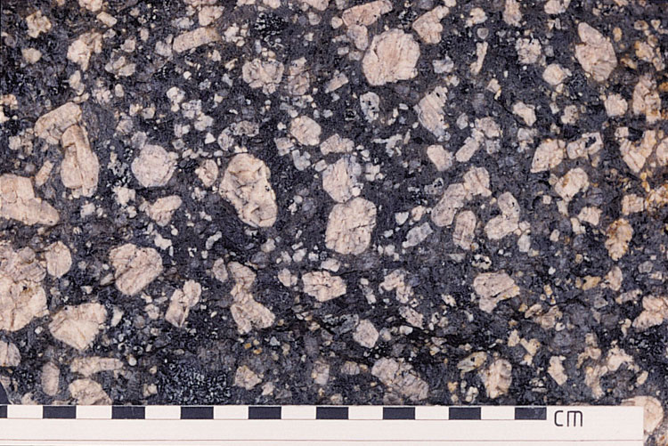 East of Fu Tau Shan, quartzphyric rhyolite dykes occur in swarms up to 100 metres wide. They include prominent quartz crystals, up to 3 mm. Contacts with megacrystic, fine-grained granite are irregular. Individual dykes, trending eastnortheast, vary from 3-30 m wide. Typically (e.g. HK9040, 811800 818970 Jko-14), they are grey and porcellanous, with pinkish feldspar megacrysts, up to 3 mm across, and quartz, dominantly 0.5 to 2 mm.