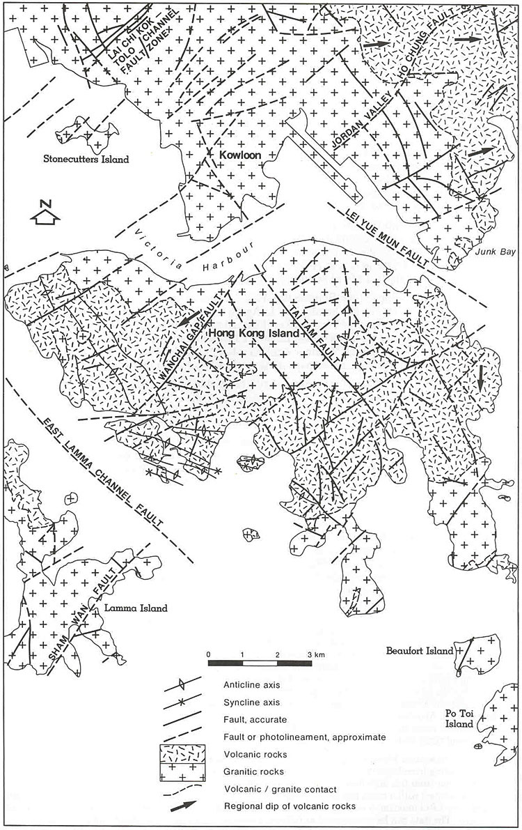 Northwestern Kowloon. Coarse-grained granite crops out in the northwest of the district, between Lai King, Lai Chi Kok, the Kowloon Reservoirs and Beacon Hill. Exposures of fresh rock are few but can be seen in recent excavations for housing estates and roads around Lai King (831300 823200 Jkt-24) and Lai Yiu (831500 823600 Jkt-25). There the granite is inequigranular, with average grain sizes of between 6 mm and 8 mm (Plate 6.A14). Biotite, as chloritised blotches, makes up less than 3% of the rock. Around Ha Kwai Chung (831200 823500 Jkt-26) east northeast trending dykes of rhyolite are common, and younger basalt dykes are also present. In places the rock is porphyritic, with randomly scattered euhedral alkali feldspars up to 20 mm. The coarse-grained granite is intruded by fine-grained granite in many places, with a very irregular contact well exposed in road cuttings at Lai Yiu Road (831610 823580 Jkt-27) and Cho Yiu Chuen (831340 823270 Jkt-28). In both cases the contacts are sharp, with small tongues of fine-grained granite intruding several metres into the coarse-grained rock. Around Byewash Reservoir (833370 823270 Jkt-29) the coarse-grained granite is faulted against the fine-grained granite by the Lai Chi Kok Tolo Channel Fault (Figure 6.A2). Here, the coarse-grained granite is characterised by large quartz pools, pink alkali feldspars and very little visible biotite. Nearby at Piper's Hill (833470 822800 Jkt-30), the coarse-grained granite is markedly inequigranular and displays distinctive interstitial fine-grained patches (Plate 6.A15).