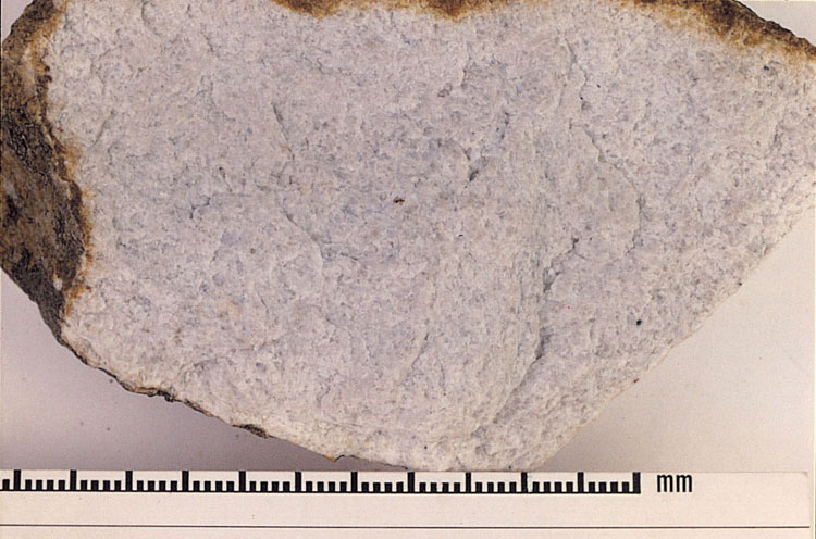 The Chek Lap Kok Granite consists of an equigranular, fine-grained, leucocratic monzogranite (Plate 6.9). Euhedral to anhedral alkali feldspar is composed principally of mesoperthite. Subordinate euhedral to subhedral albite is unzoned and anhedral quartz is weakly strained. Interstitial late stage muscovite is common along with trace amounts of euhedral fluorite. Biotite, zircon, and Fe-oxide may also be present in trace amounts.